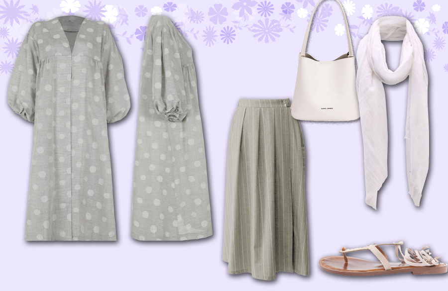 صندلهای تابستانه بنددار تخت به خوبی با دامنهای بلند ست می شوند بنابراین انتخاب ما در این ست زنانه خنک و تابستانه یک جفت صندل سفید بندی از برند صاد خواهد بود. پالت انتخابی ما برای این ست زنانه راحت و خنک ترکیب رنگی طوسی روشن و سفید است بنابراین یک شال سفید نخی و یک کیف دستی چرمی سفید از برند دیوید جونز را برای تکمیل این ست تابستانه انتخاب کردهایم.