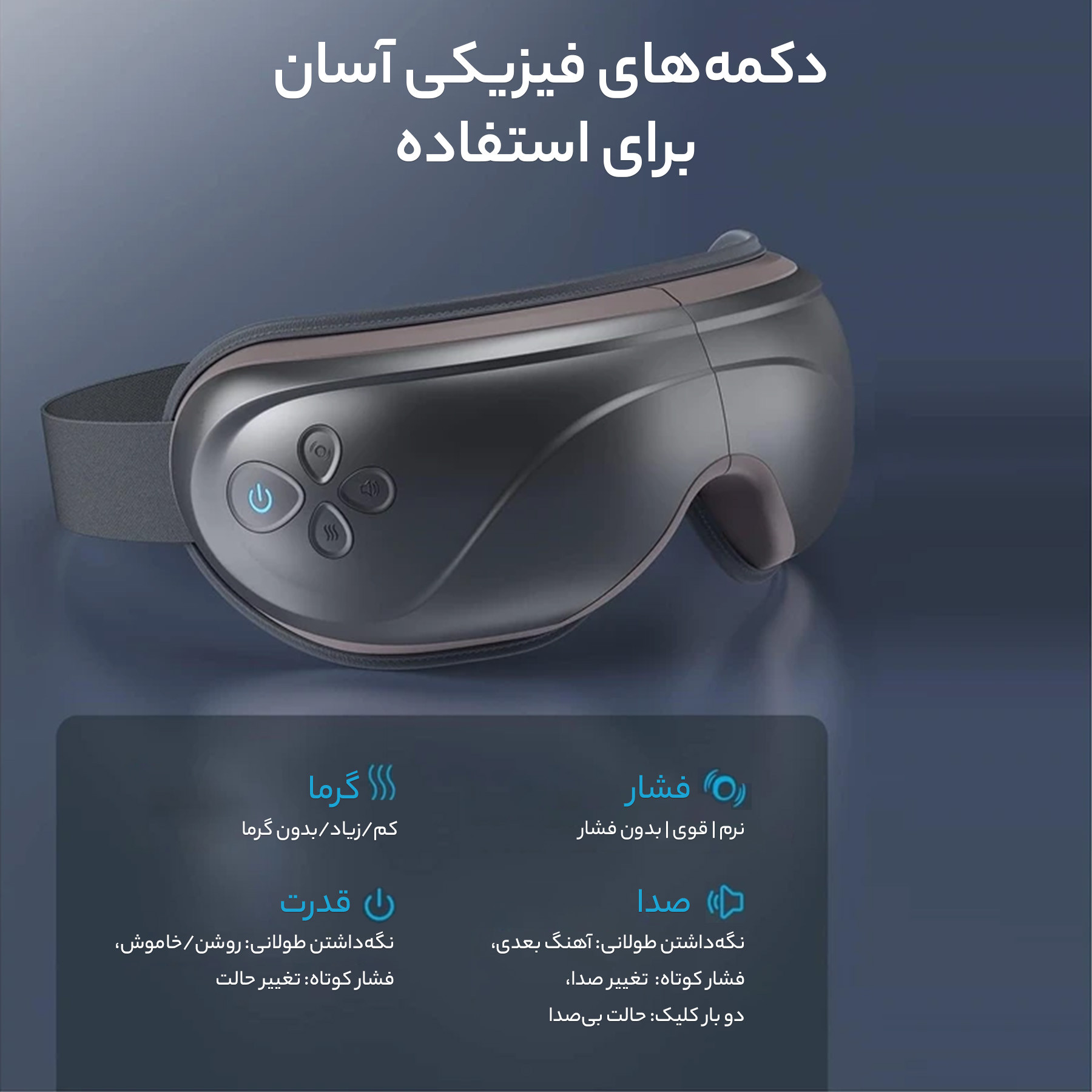 نکات: هنگامی که ماساژور چشم ما با فشرده سازی و لرزش کار می کند، که ممکن است باعث ایجاد صداهای طبیعی کمتر از 55 دسی بل شود.