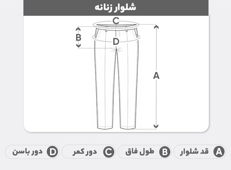 قد قسمت داخلی شلوار از فاق تا پایین برابر 67 سانتی متر و قد شلوار از قسمت کمر تا پایین 95 سانتی متر است