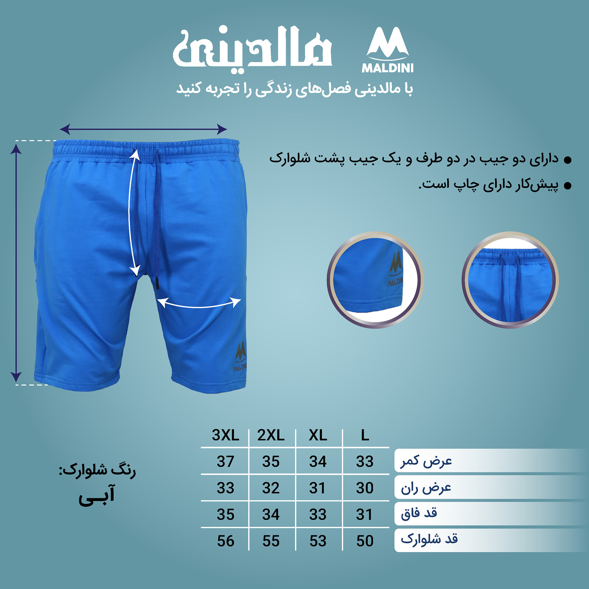 - جزئیاتدارای دو جیب در دو طرف، و یک جیب در پشت شلوارک