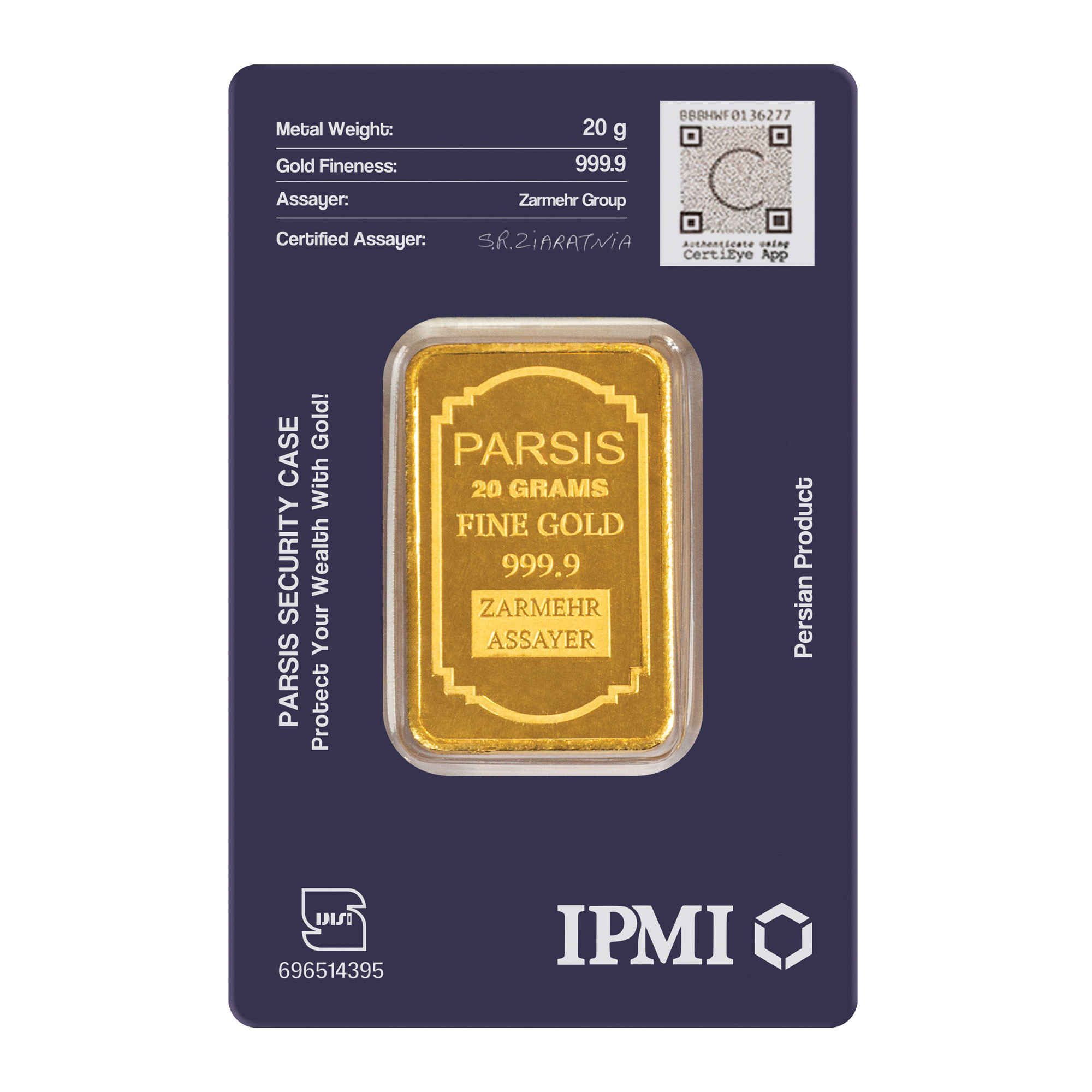 - سایر توضیحاتشمش طلای پارسیس، تنها شمش ایرانی با عیار 24 و خلوص 999.9 (کاملا خالص) است. این شمش ها در بسته بندی امنیتی غیر قابل جعل و دارای QR CODE امنیتی اختصاصی به همراه بسته بندی زیبا و نفیس مناسب هدیه ارسال می گردد. طلای پارسیس تنها عضو ایرانی سازمان جهانی فلزات گرانبها (International Precious Metal Institute) است.