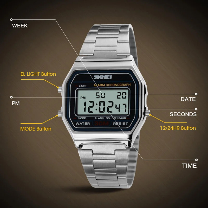 - قابلیتهای تخصصی ساعتنمایش 24 ساعتهنور پسزمینهتاریخشمارآلارمضدآبتایمر