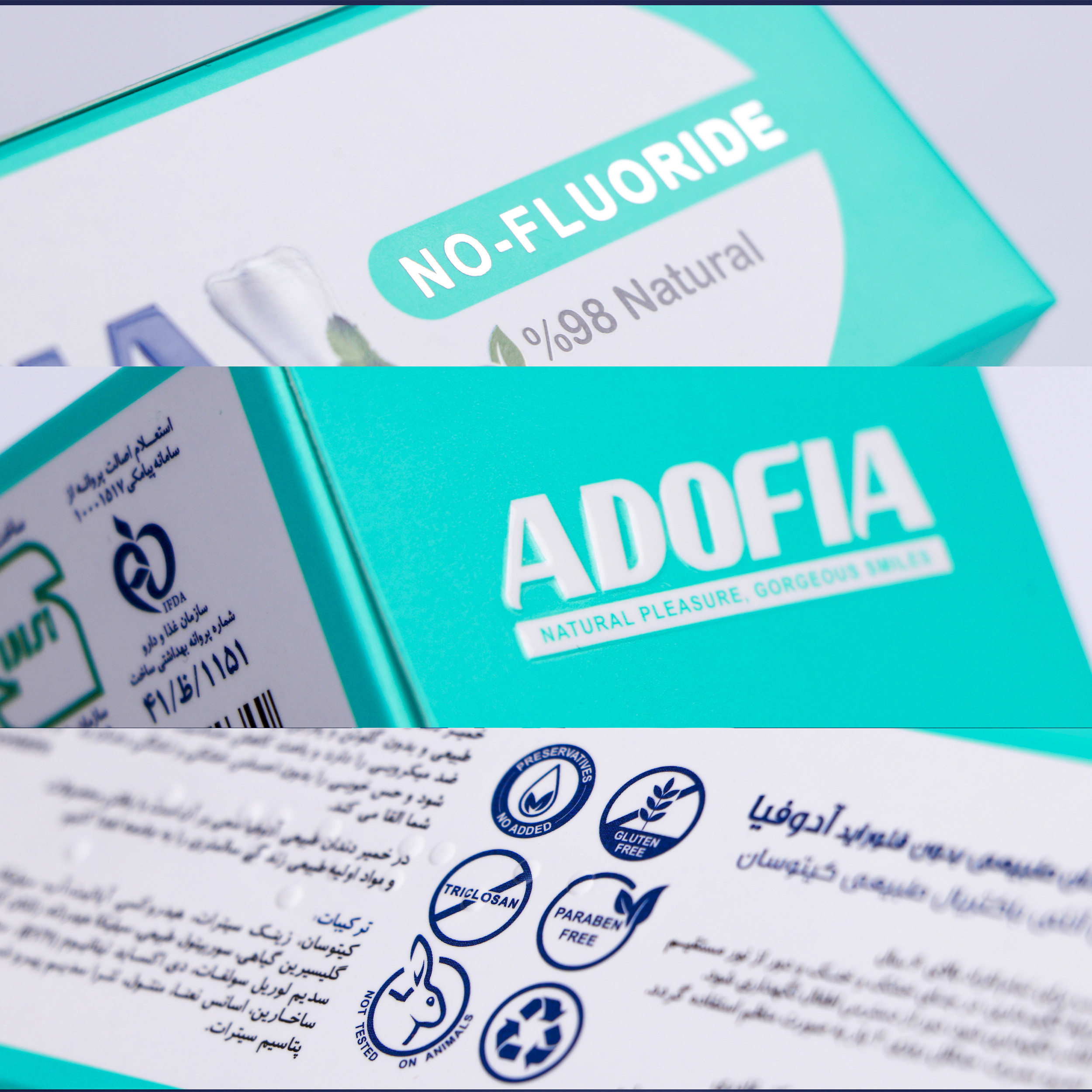 - سایر مشخصاتترکیبات : کیتوسان، زینک سیترات، هیدروکسی آپاتیت، گلیسیرین گیاهی، سوربیتول طبیعی و ...و این محصول بدون فلوراید می باشد..چند منظوره بودن خمیر دندان طبیعی آدوفیا مدل بدون فلوراید به جهت موارد زیر است: 1-جلوگیری از پوسیدگی دندان 2- سفید کننده دندان 3- ضد حساسیت 4- محافظت از لثه 5- حذف جرم دندان 6- پر کردن حفره 7- تقویت مینای دندان 8- بدون فلوراید 9- بدون گلوتن و پاربن 10- رفع بوی بد دهان 11- نفس تازه 12- از بین بردن لکه 13- ضد باکتری 14- ضد قارچ