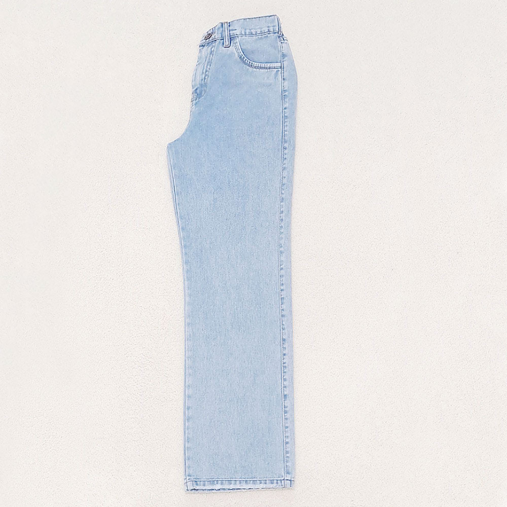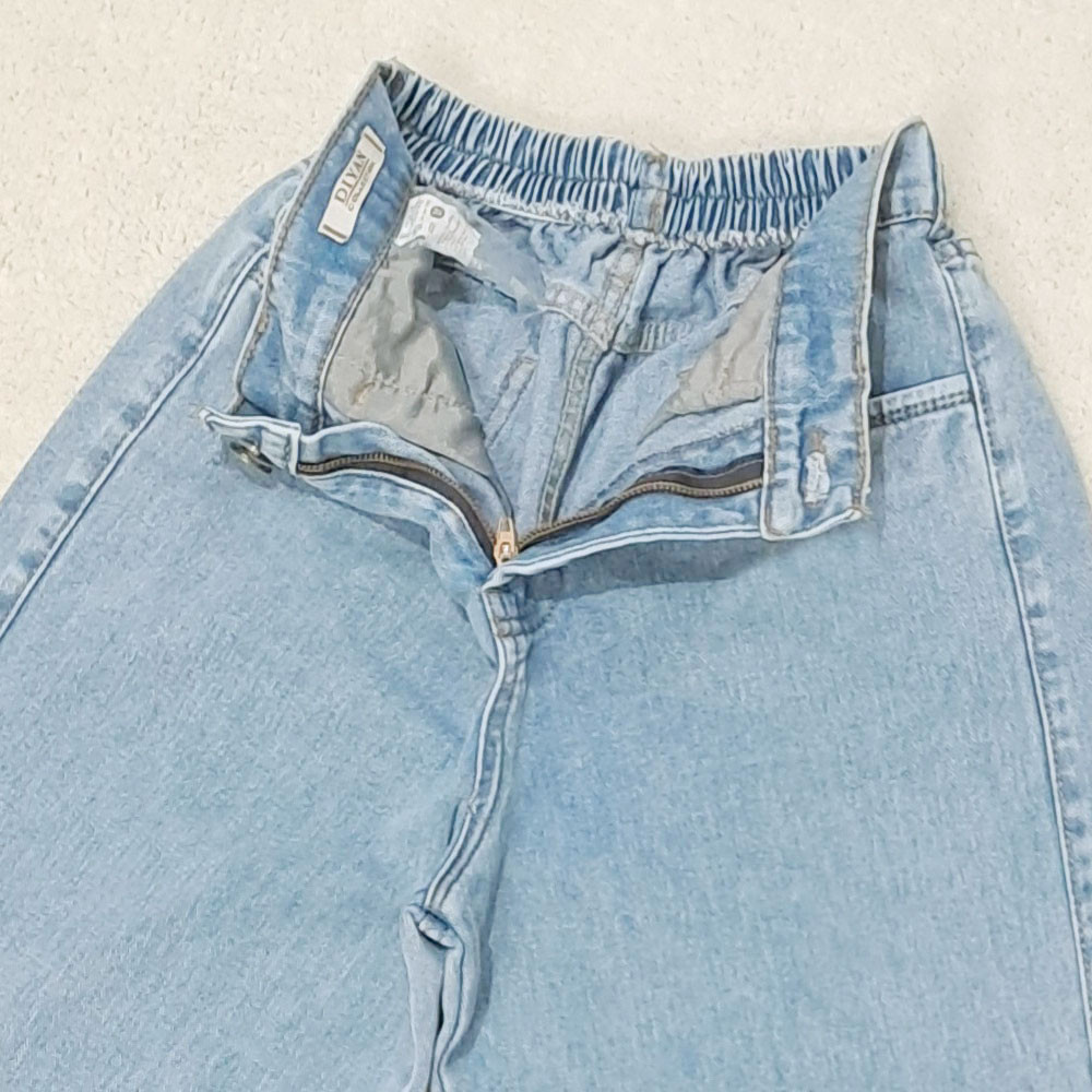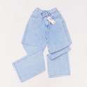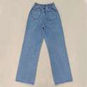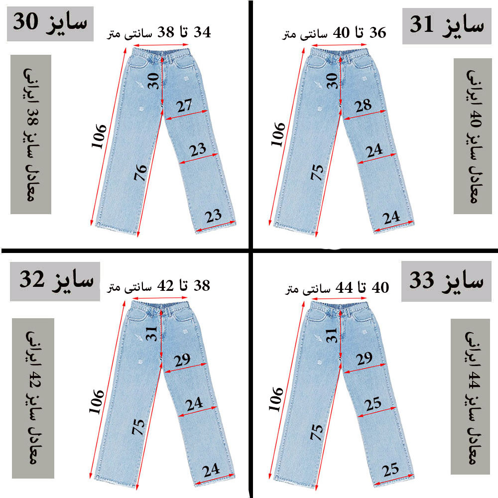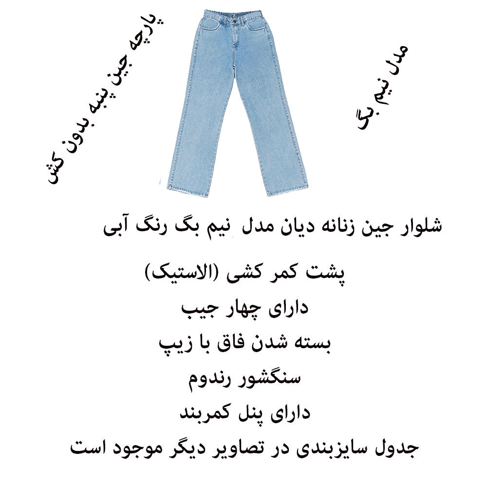 (پارچه ی جین پنبه بدون کش) (مدل نیم بگ) (جدول انتخاب سایز در قسمت تصاویر) (دارای چهار جیب) (پشت کمر کشی) (بسته شدن فاق با زیپ) (رنگ آبی روشن ، سنگشور رندوم)