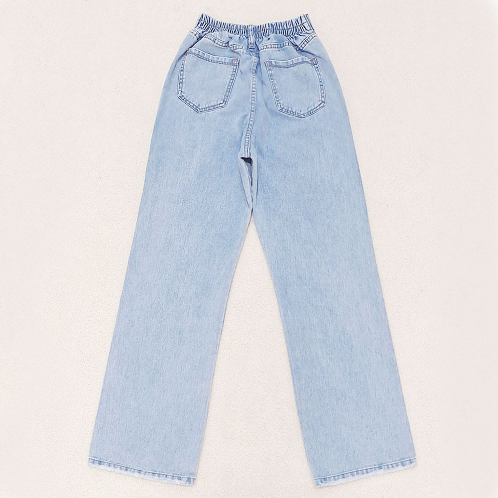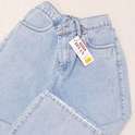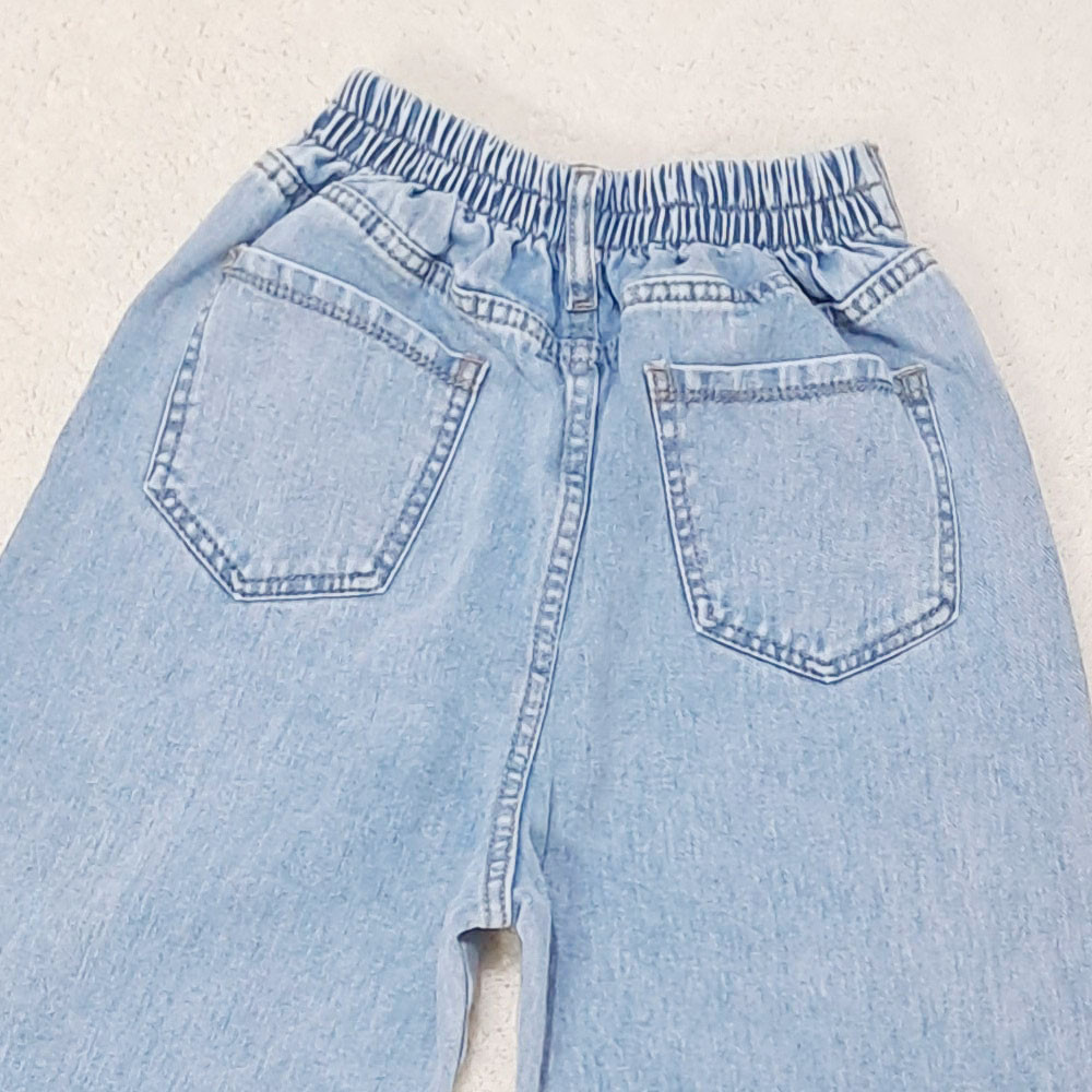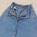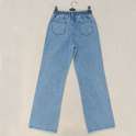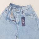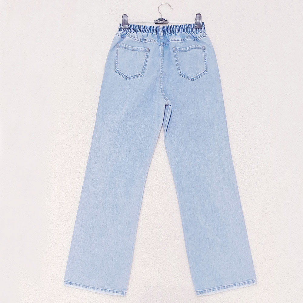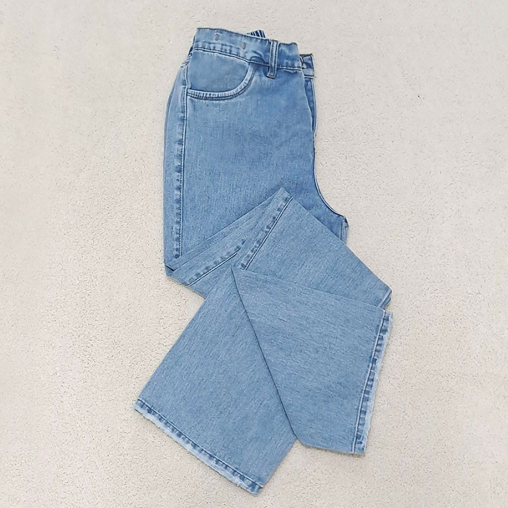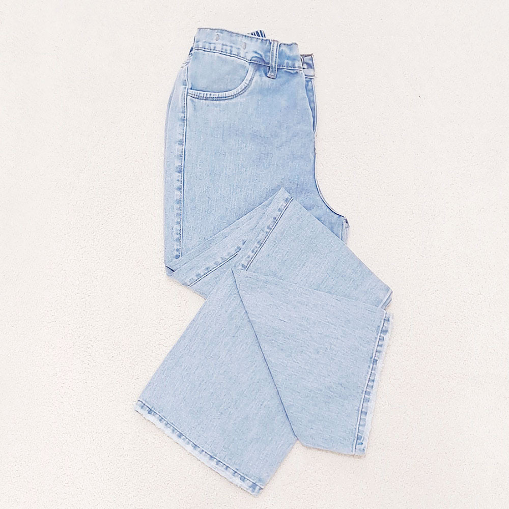 (پارچه ی جین پنبه بدون کش) (مدل نیم بگ) (جدول انتخاب سایز در قسمت تصاویر) (دارای چهار جیب) (پشت کمر کشی) (بسته شدن فاق با زیپ) (رنگ آبی روشن ، سنگشور رندوم)