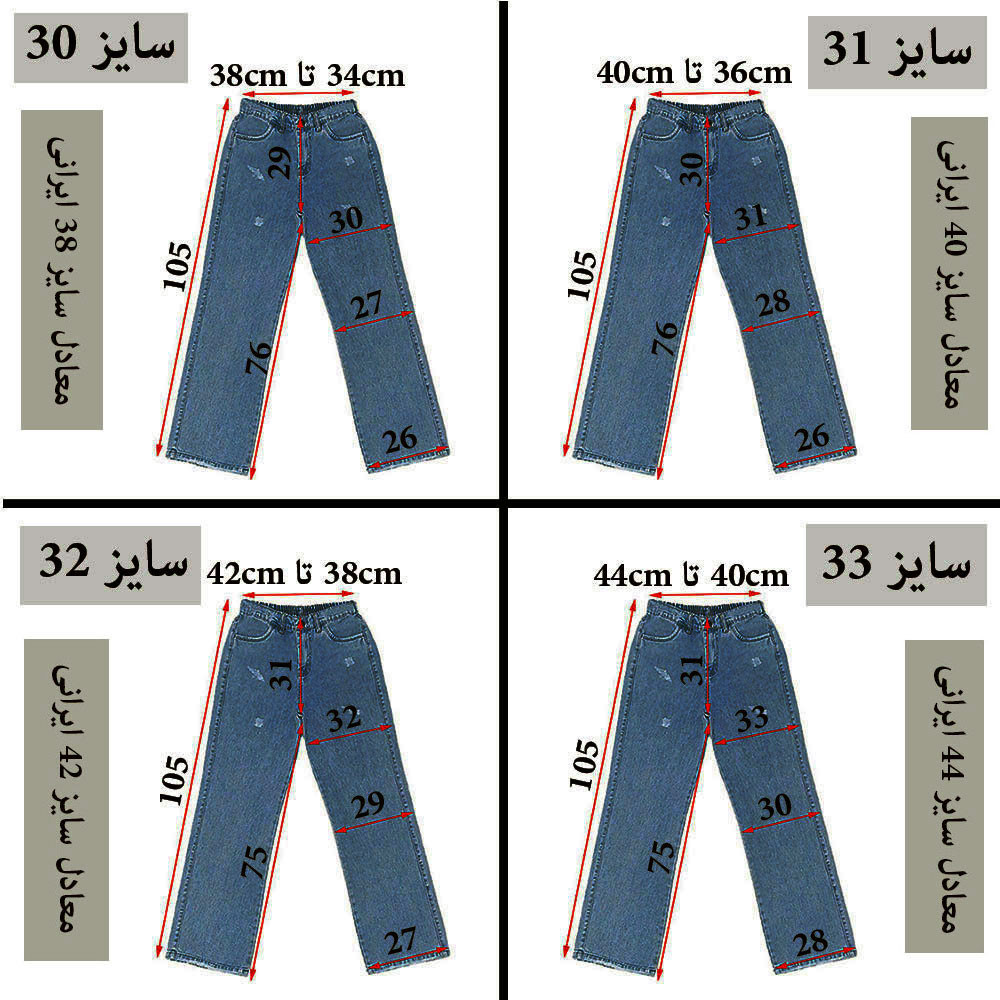 - جزئیات(پارچه ی جین پنبه بدون کش) (مدل بگ) (جدول انتخاب سایز در قسمت تصاویر) (دارای چهار جیب) (پشت کمر کشی) (بسته شدن فاق با زیپ) (رنگ سرمه ای ، سنگشور رندوم)