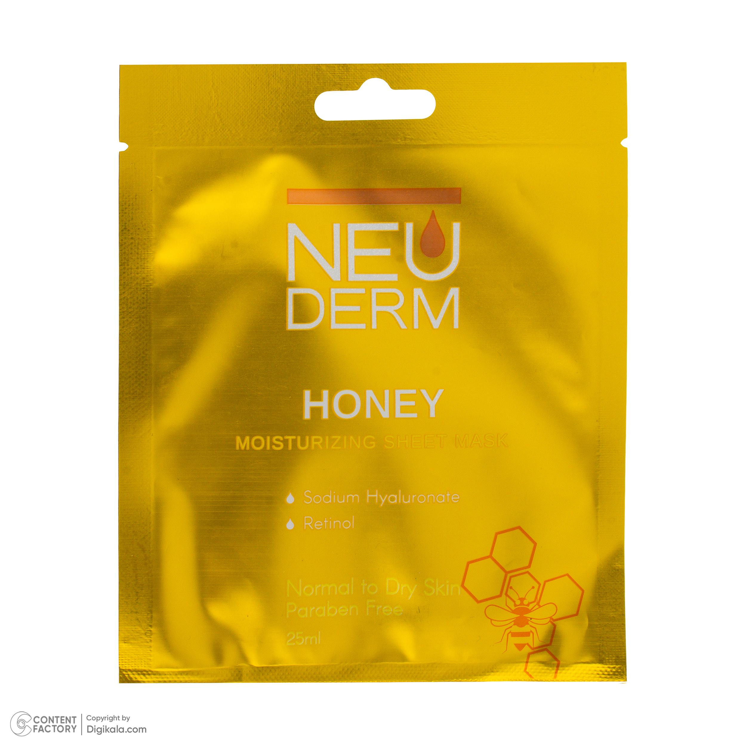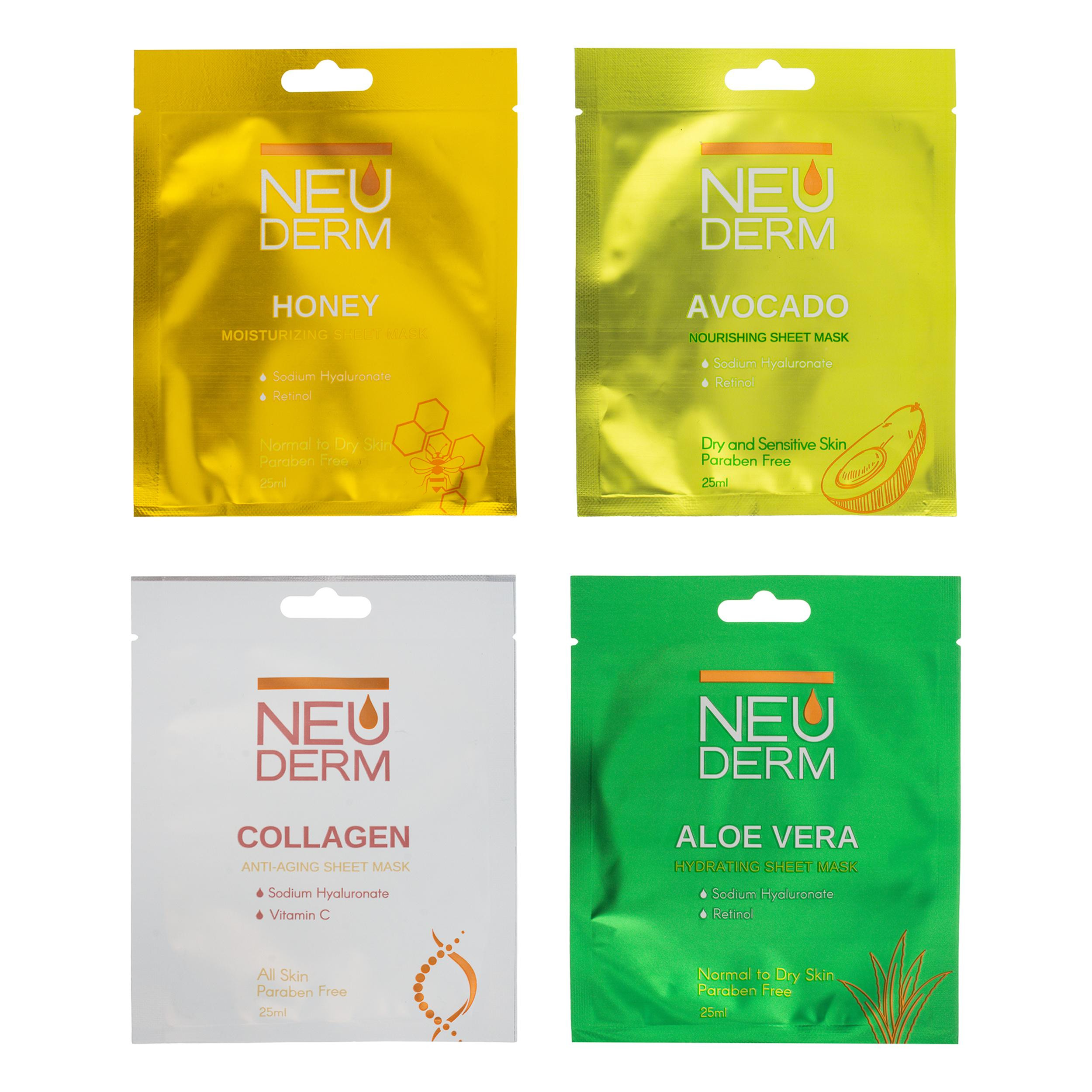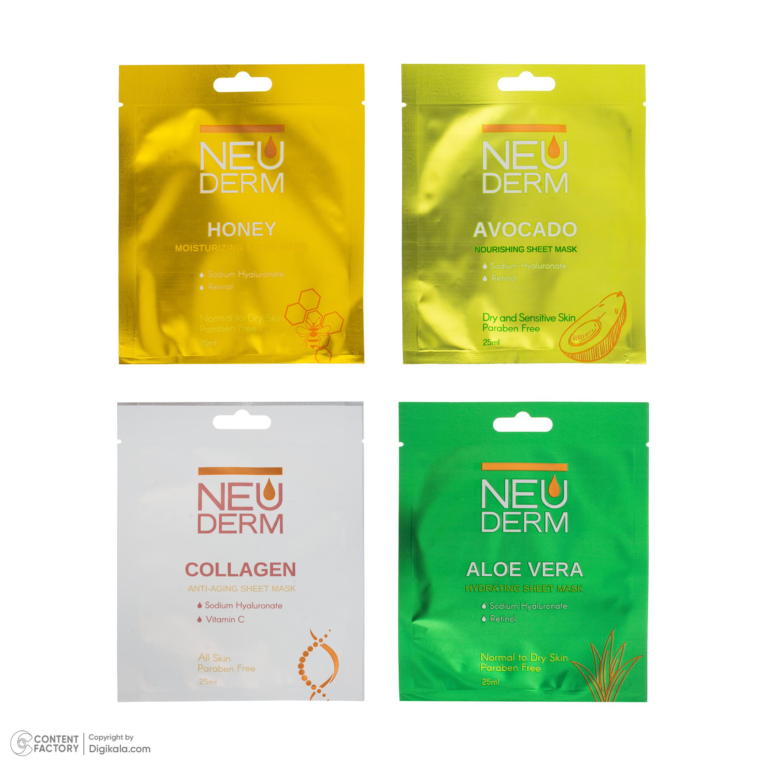 ماسک صورت نئودرم مدل عسل، آلوئه ورا، کلاژن و آووکادو مناسب برای پوست خشک و حساس حجم 25 میلی لیتر بسته 4 عددی