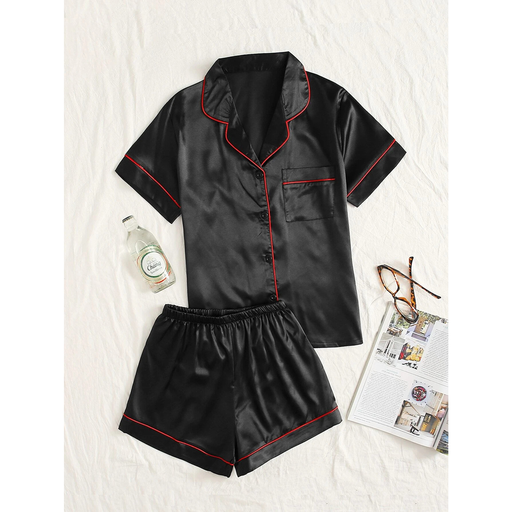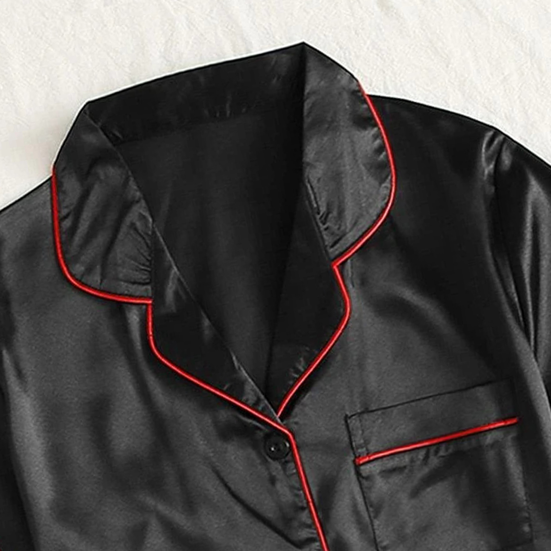 ست لباس خواب زنانه شامل شومیز قیطون دوزی ساتن و شلوارک قیطون دوزی ساتن می باشد.