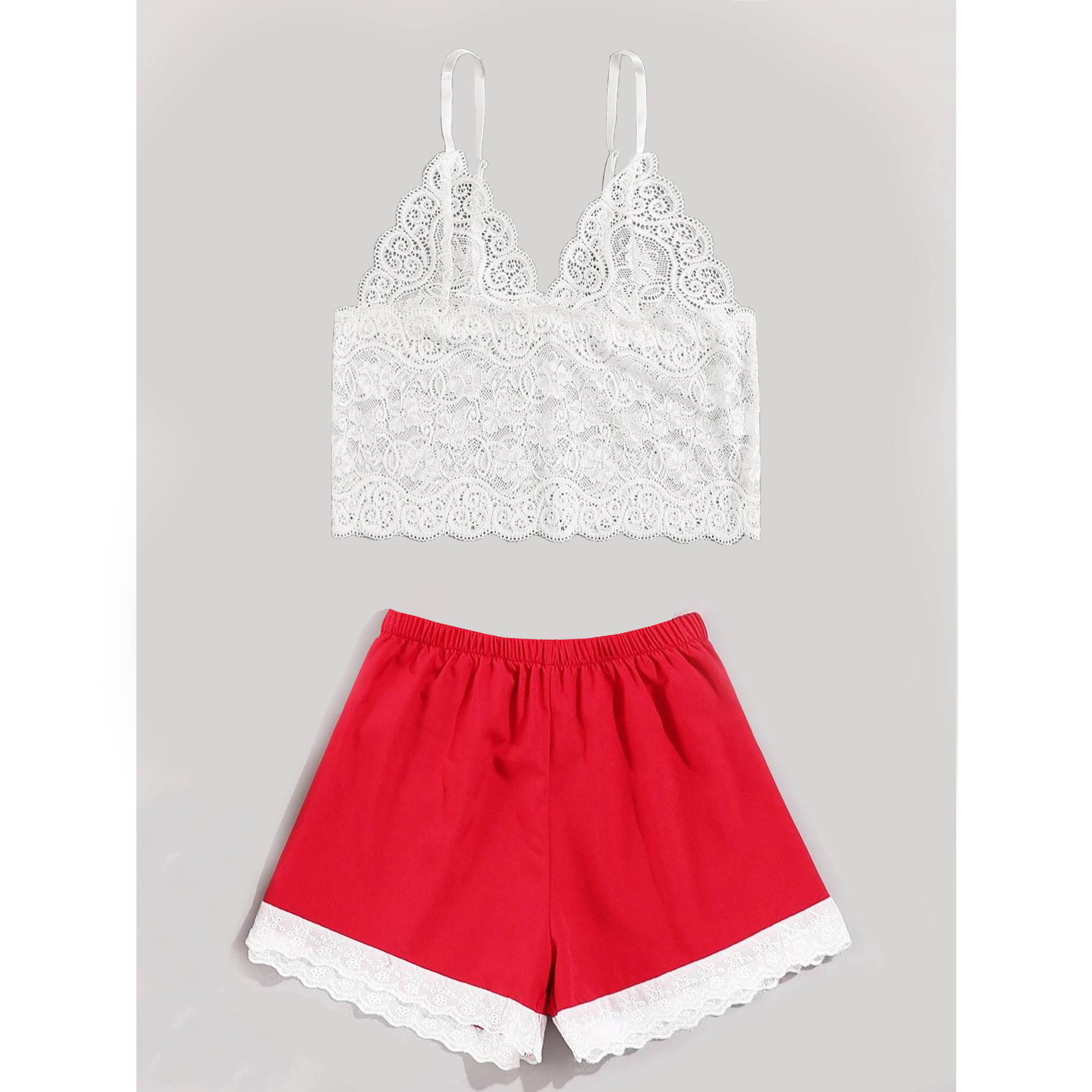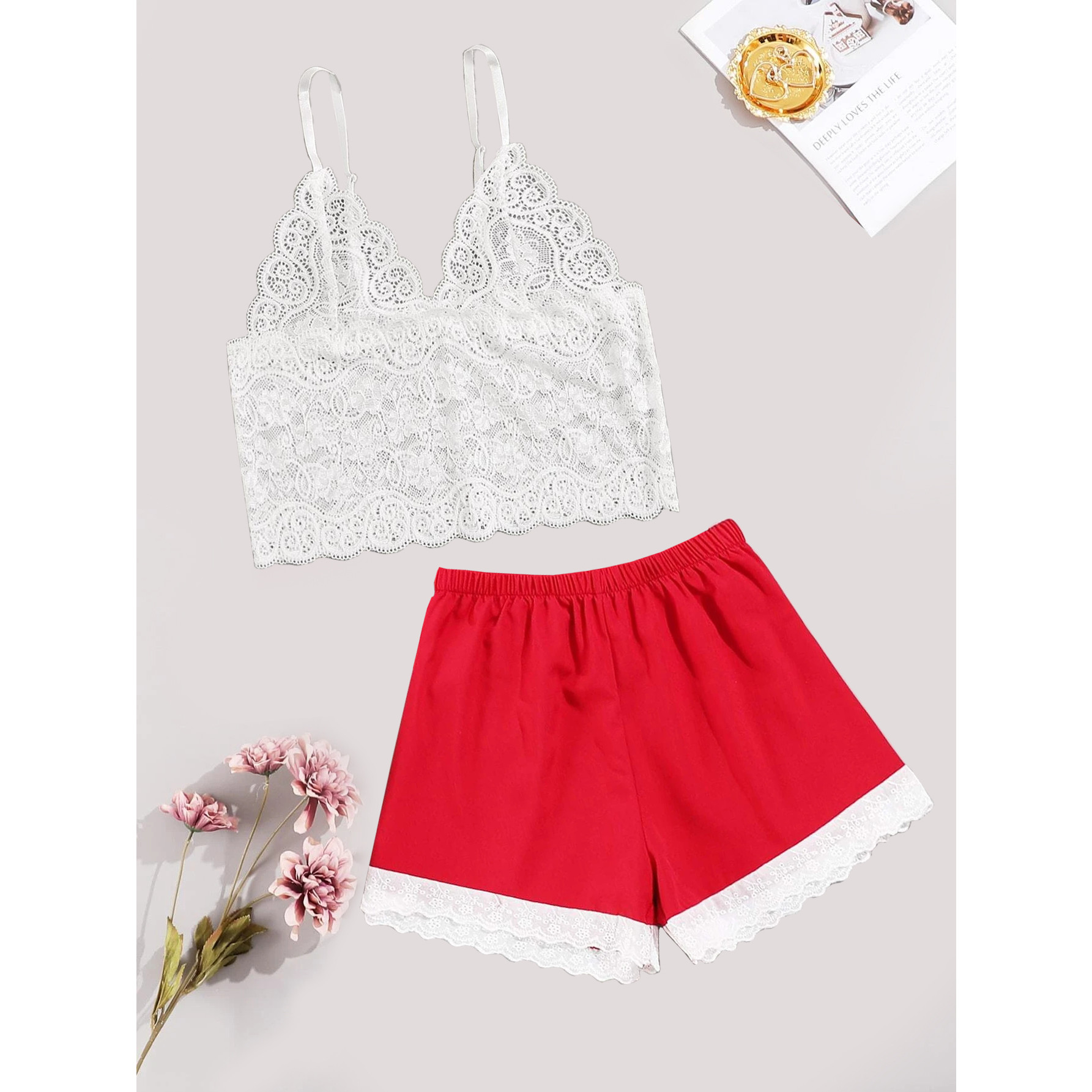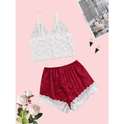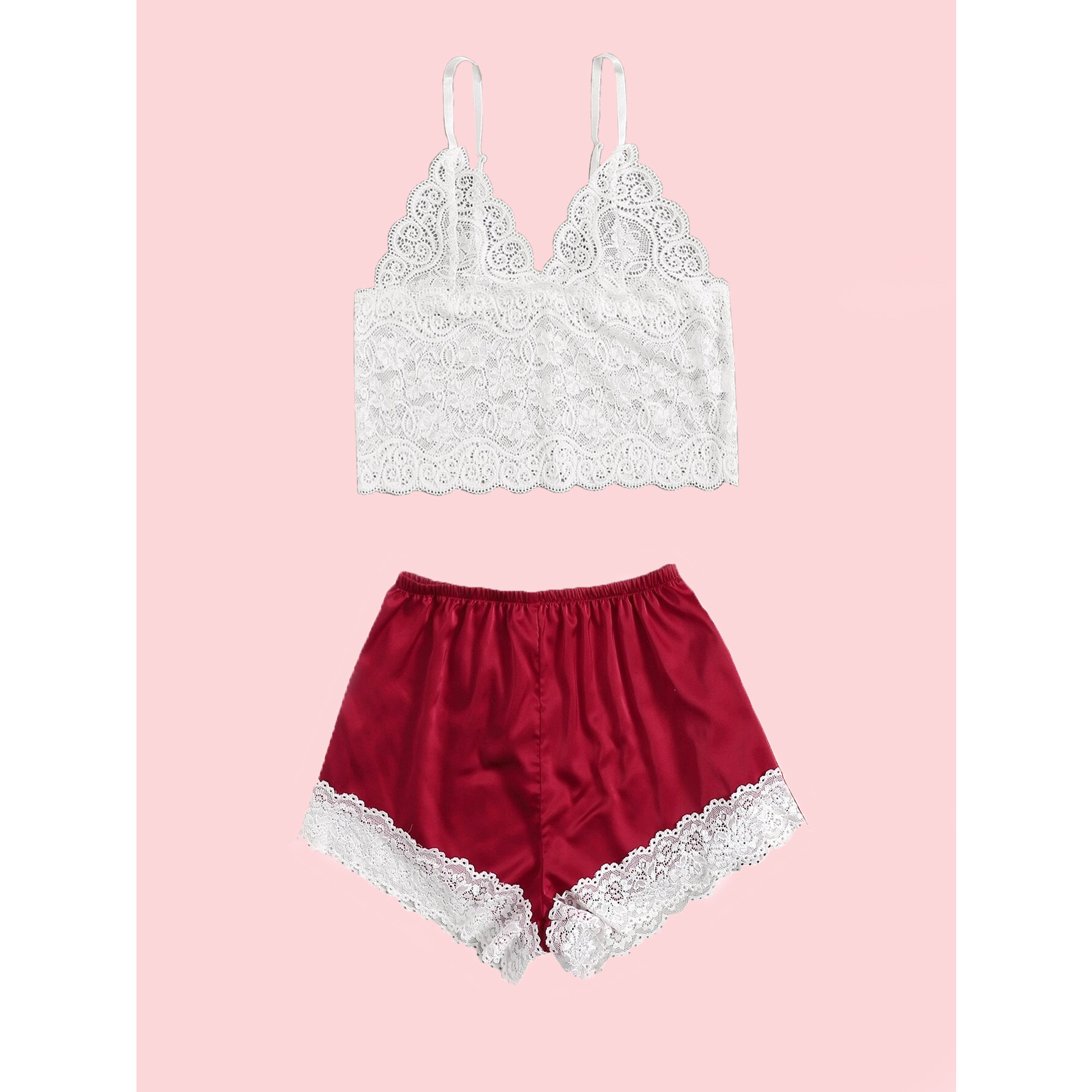 -ست لباس خواب زنانه شامل شلوارک ساتن و نیم تنه گیپور - نگهداری-شستشو با دمای 30 درجه یا کمتر