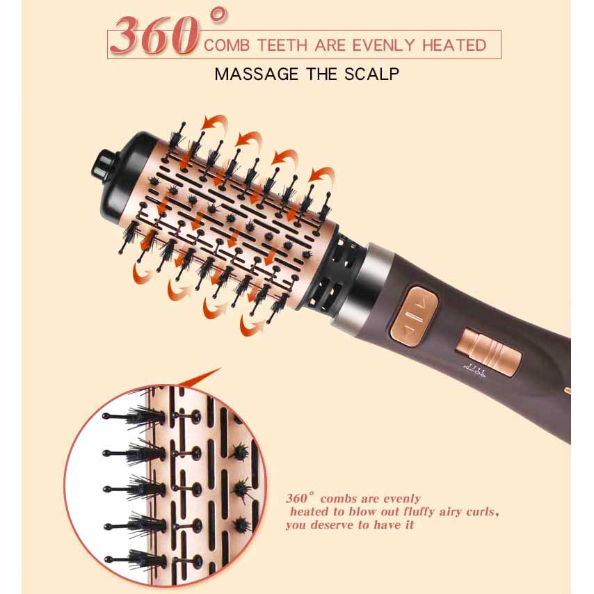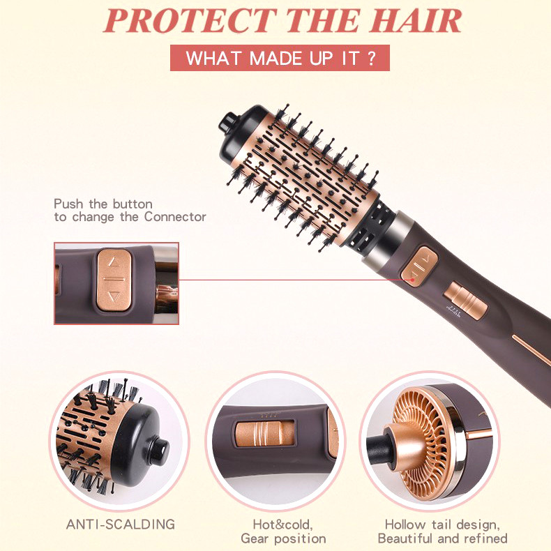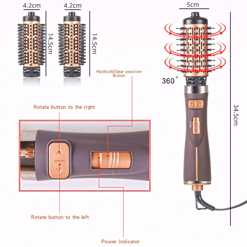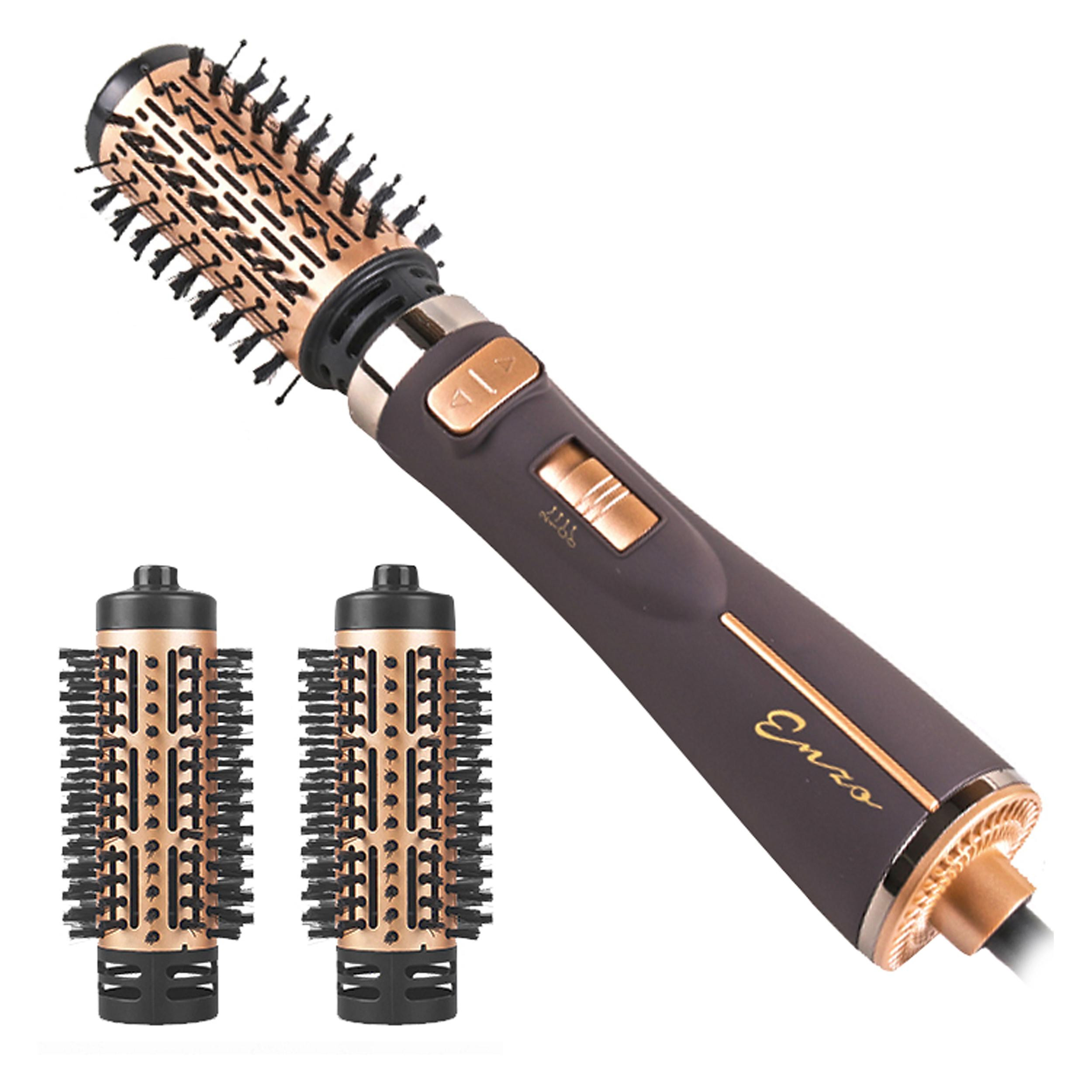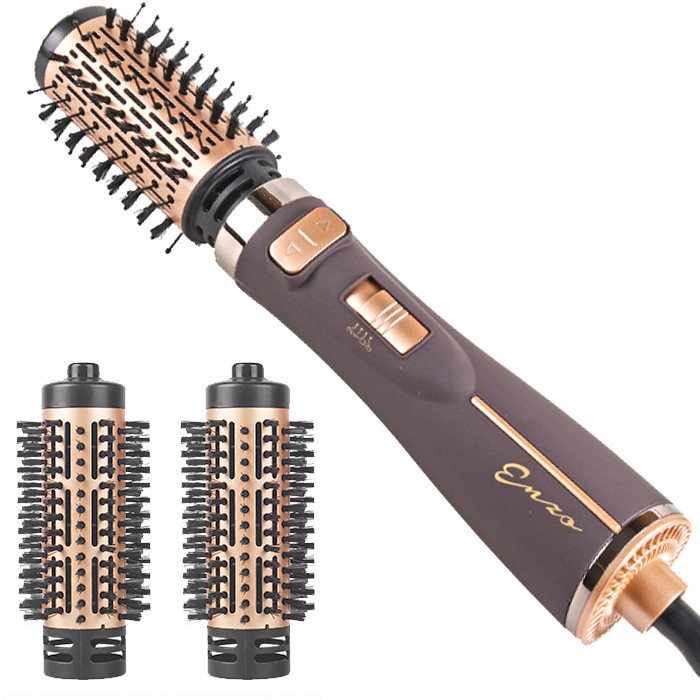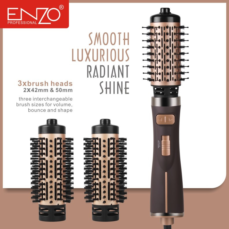 سشوار برس‌دار چرخشی حرفه‌ای انزو مدل EN-743، موتور DC با توان مصرفی 1500 وات، دارای قابلیت تعویض سری، باد سرد، با حالت صاف‌کننده و حجم‌دهنده، وزن 700 گرم، تنظیم حرارت 2 حالته و کنترل سرعت 2 حالته، به همراه 2 سری برس‌دار