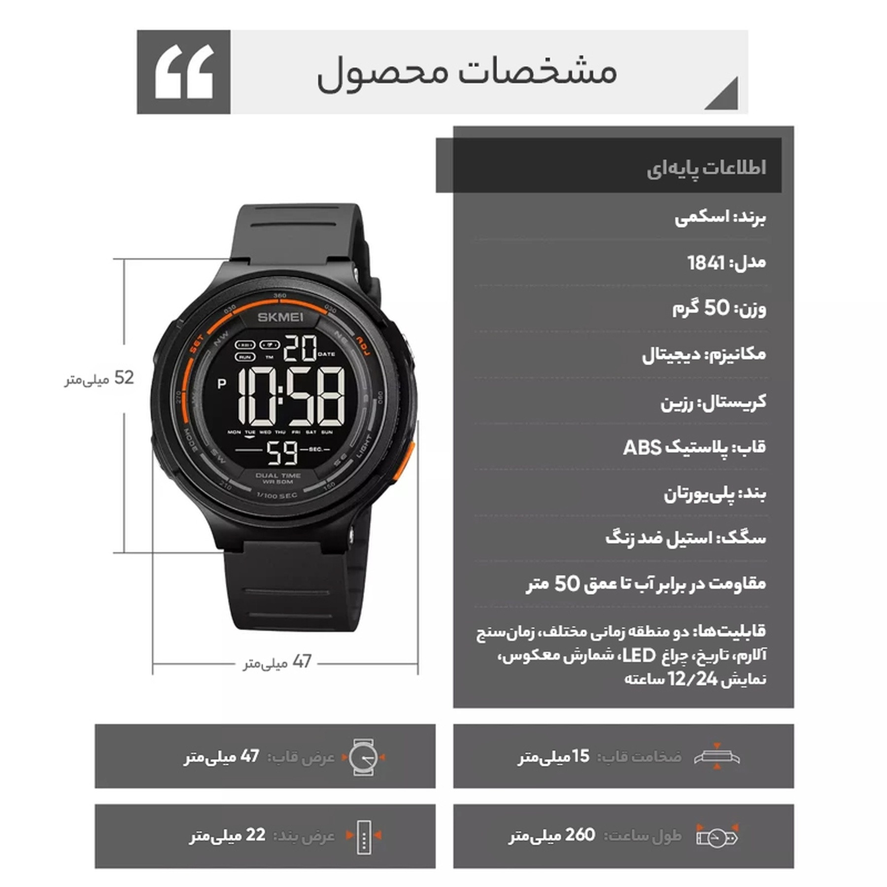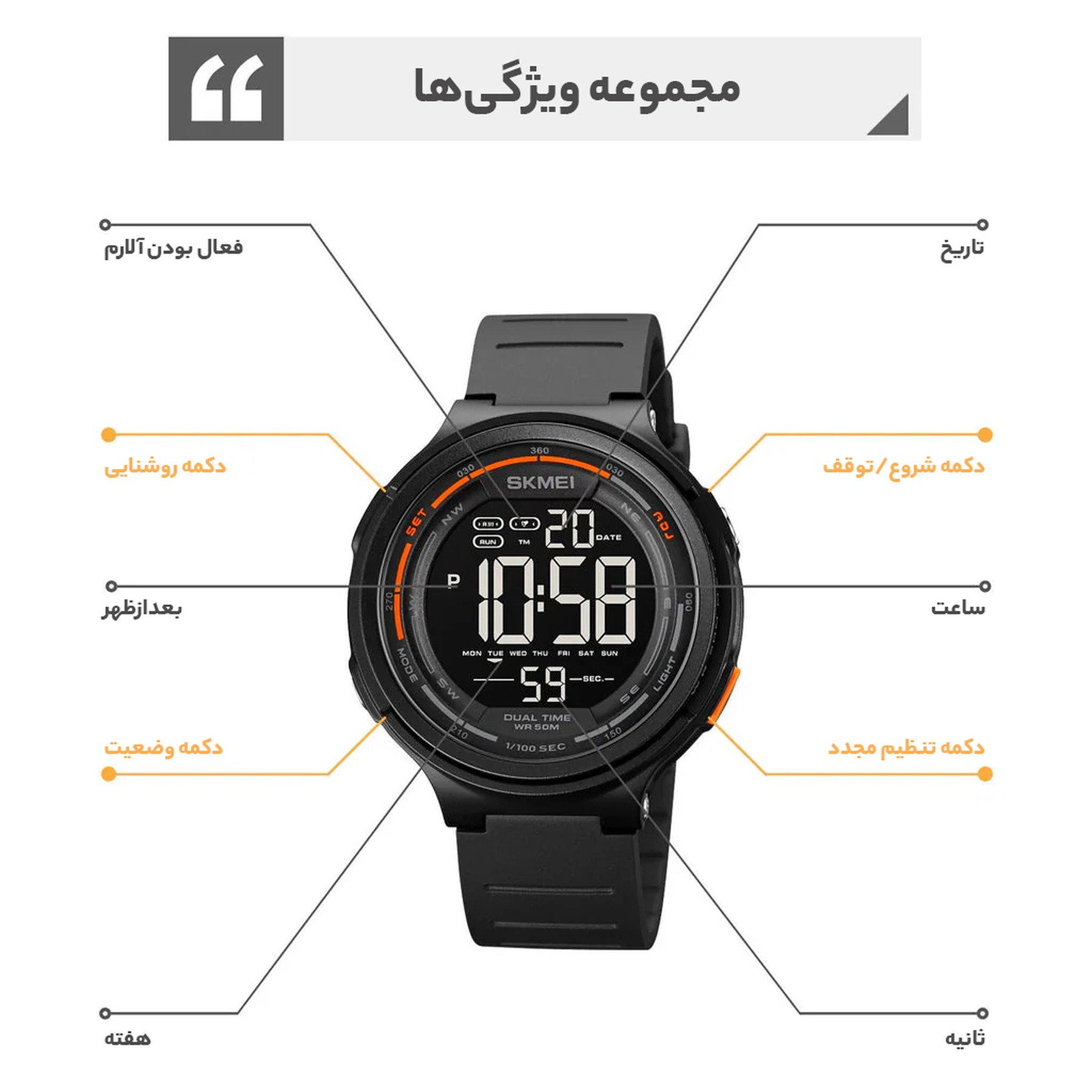 - قابلیتهای تخصصی ساعتنمایش 24 ساعتهنمایش ساعت دومتاریخشمارنور پسزمینهتایمرآلارم